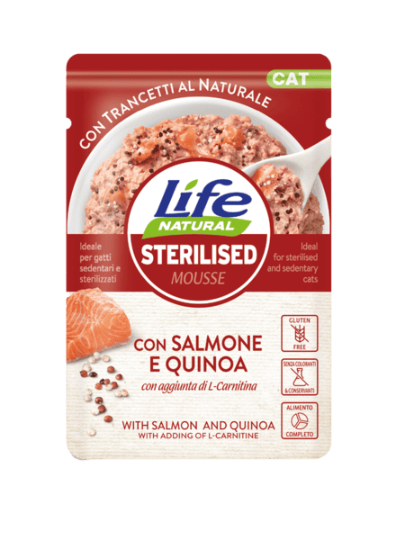 Life Cat Sterilized è l’alimento umido perfetto per gatti sterilizzati, ricco di salmone e quinoa. Un pasto equilibrato che supporta la salute del tuo felino, mantenendo peso e benessere ottimali.