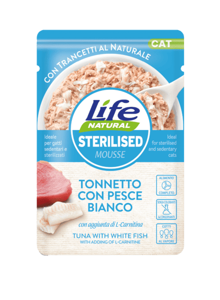 Life Cat Sterilized è l’alimento umido perfetto per gatti sterilizzati, formulato con tonnetto e pesce bianco di alta qualità. Un pasto nutriente che supporta il benessere e mantiene il peso ideale del tuo felino.