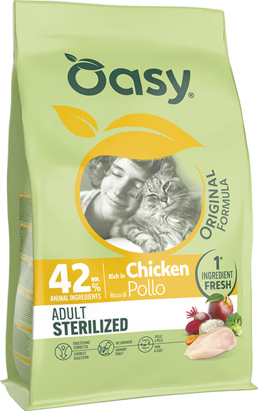 Oasy Original Adult Sterilized Pollo è un alimento secco completo specificatamente formulato per gatti adulti sterilizzati e castrati. Questa ricetta bilanciata, con il 14% di pollo fresco come primo ingrediente, offre una nutrizione ottimale studiata per rispondere alle esigenze specifiche dei gatti sterilizzati, che necessitano di un’alimentazione mirata per mantenere il peso forma e la salute delle vie urinarie.