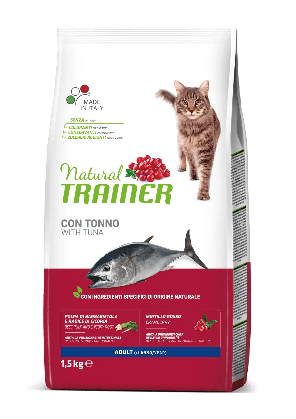Composizione:Pollo fresco, riso, granturco, proteina di granturco, proteine disidratate di pollo e tacchino, proteine disidratate di tonno 7%, grasso di origine animale, tonno 4%, proteine disidratate di manzo, fioretto di granturco, polpa di barbabietola* 2,4%, proteine animali idrolizzate, semi di lino*, fibra di pisello*, sostanze minerali, estratto secco di radice di cicoria (fonte di inulina)* 0,7%, lievito di birra, olio di granturco, alghe (Schizochytrium spp.)*, estratto secco di mirtillo rosso* 0,02%.