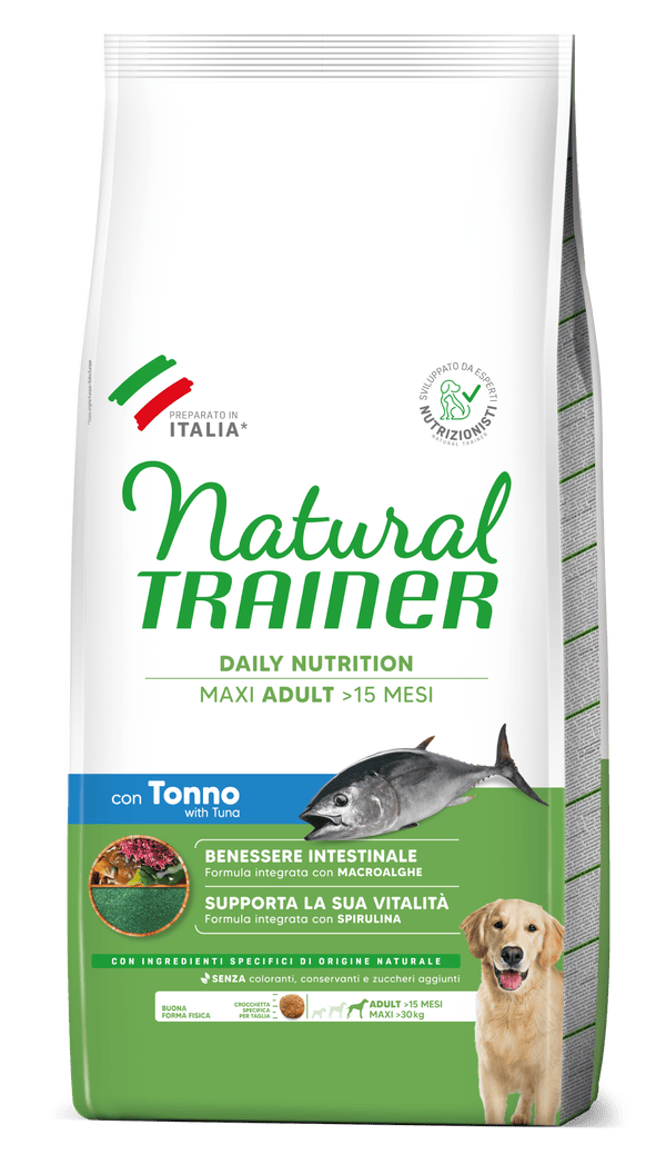 Proteine disidratate di pollo e tacchino , granturco , pollo fresco , fioretto di granturco , riso 11% , grasso di origine animale , tonno 4% , proteine animali idrolizzate , polpa di barbabietola* , semi di lino* 2,5% , proteine disidratate di tonno , proteina di granturco , olio di granturco , sostanze minerali , lievito autolisato 0,75% , estratto secco di radici di cicoria (fonte di inulina)* , lignocellulosa , mela disidratata in polvere* 0,15% , concentrato di limone in polvere* 0,1% , spirulina (Arthrospira platensis)* 0,1% , peptidi di collagene bioattivi 0,06%. , *Ingredienti di origine naturale specifica. ADDITIVI NUTRIZIONALI: vitamina A 26000 UI, vitamina D3 1350 UI, vitamina E 355 mg, solfato di rame(II) pentaidrato 49,13 mg (rame: 12,5 mg), carbonato di ferro(II) 310,5 mg (ferro 150 mg), iodato di calcio anidro in granuli rivestiti 3,85 mg (iodio 2,5 mg), selenito di sodio 0,44 mg (selenio 0,2 mg), ossido di zinco 193,4 mg (zinco 156 mg), ossido di manganese (II) 45,1 mg (manganese 35 mg)., Additivi tecnologici: clinoptilolite di origine sedimentaria 4000 mg. proteina grezza 26%, grassi grezzi 14%, fibre grezze 3%, ceneri grezze 6,5%, magnesio 0,1%, Omega-3 0,9%, Omega-6 3%.